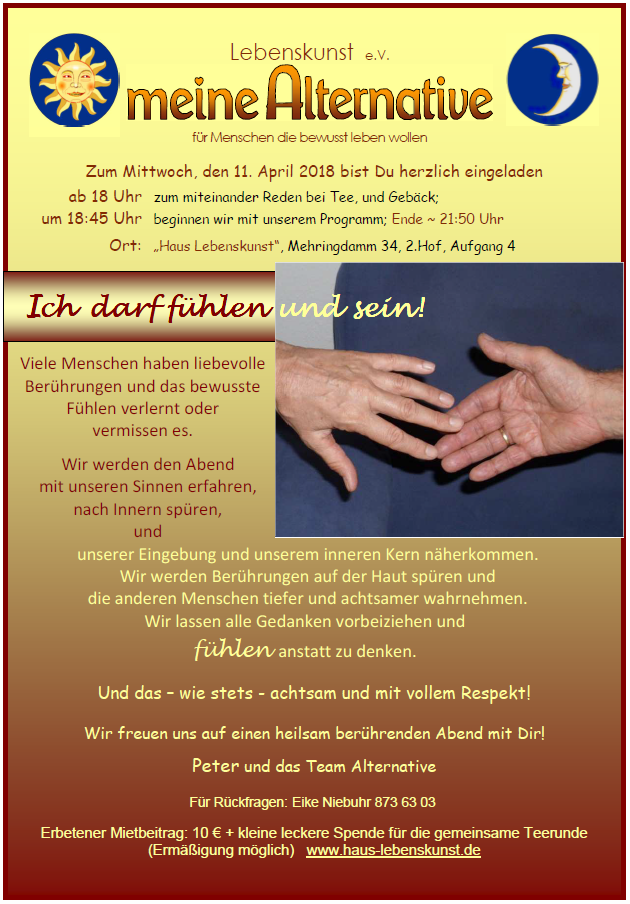 Das Team von "meine Alternative" lädt einmal im Monat mittwochs im Haus Lebenskunst zu einem gestalteten Abend ein, immer mit Gedankenaustausch.