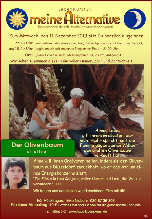 Im Oktober wurde unser großer Saal renoviert und unser Abend musste leider ausfallen. So nehmen wir den ausgezeichneten Film „Der Olivenbaum“, eine Tragikomödie; zum Anlass, über Liebe und Zorn, nachhaltige Ökologie und gewinnträchtige Ökonomie Gedanken auszutauschen.