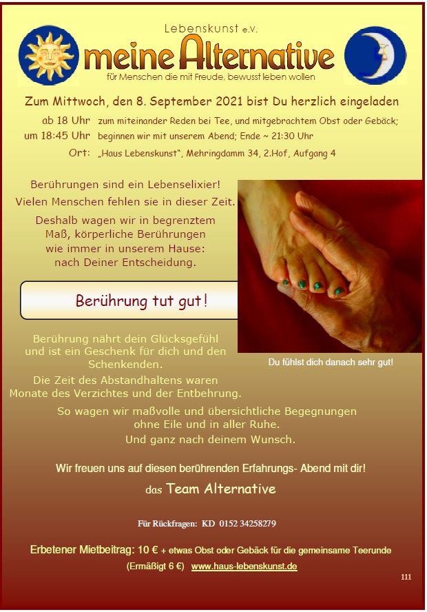 Das Team von "meine Alternative" lädt einmal im Monat mittwochs im Haus Lebenskunst zu einem gestalteten Abend ein, immer mit Gedankenaustausch.