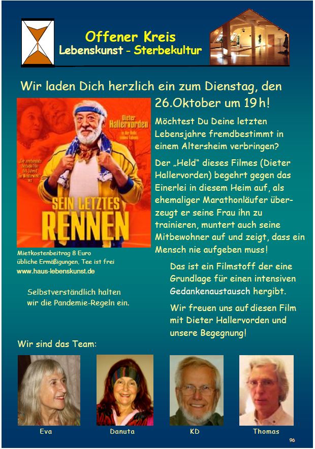 Der Offene Arbeitskreis Lebenskunst - Sterbekultur lädt einmal im Monat dienstags im Haus Lebenskunst ein zu einem Gedankenaustausch.